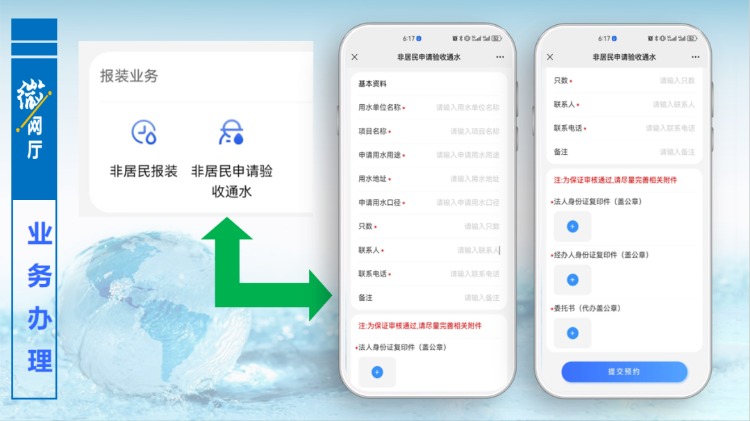 當用水施工完成,達到通水條件,用戶同樣可在“微網廳”中,辦理驗收通水申請,填寫相關信息,上傳附件,提交預約,后臺工作人員會主動聯(lián)系用戶,進行驗收通水。