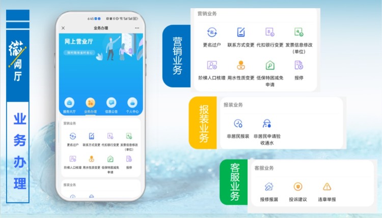 客服業(yè)務版塊主要是針對報修報漏,只要提交相關信息,工作人員會及時與用戶取得聯(lián)系進行處理。“微網廳”已開通投訴建議通道,對用戶提出的投訴和建議,將會第一時間進行回復和處理,同時歡迎大家對身邊的違章用水現(xiàn)象進行舉報。