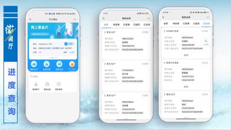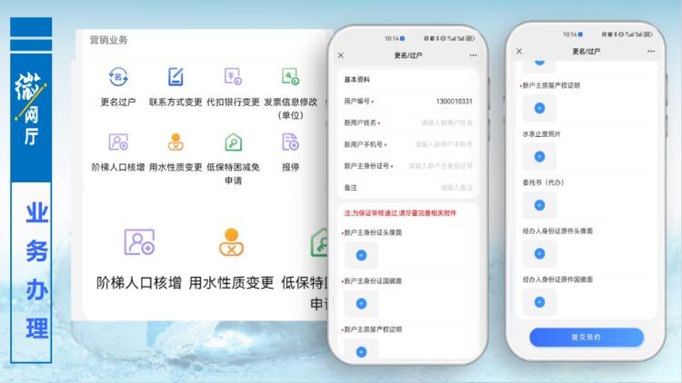 以更名過戶為例,用戶點擊更名過戶功能按鈕,進入提交資料界面,按照頁面提示,填寫相關信息和拍照上傳附件,提交預約,后臺管理人員審核通過,便完成更名過戶辦理,用戶無需再到營業(yè)大廳線下辦理任何手續(xù)。